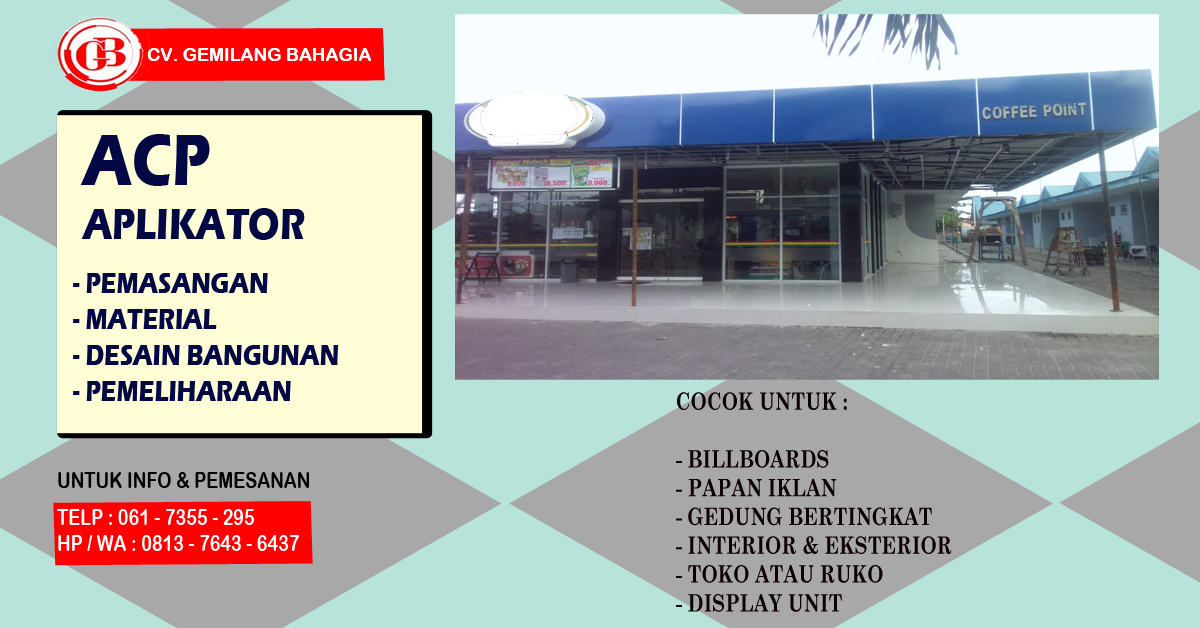 CV. Gemilang bahagia telah memberikan pelayanan yang aman dan nyaman bagi konsumen / pembeli. Sudah terbukti dengan tingginya peminat yang memakai produk dan jasa pemasangan ACP dari kami.